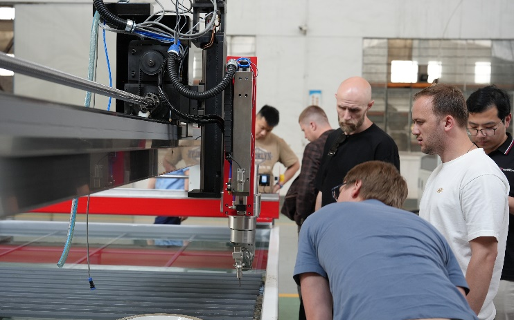本次参观中,欧洲团队实地考察了生产车间与技术实验室,深入了解设备研发流程与质量管控体系,并现场观摩了五轴水刀切割复合材料的演示。双方围绕新能源设备切割需求展开技术研讨,永昌团队针对客户提出的材料特性与精度要求提供专业的定制化方案,获得了高度认可。目前双方已在定制化生产线方面达成初步合作意向,后续将进一步推动达成中欧高端装备技术协作。