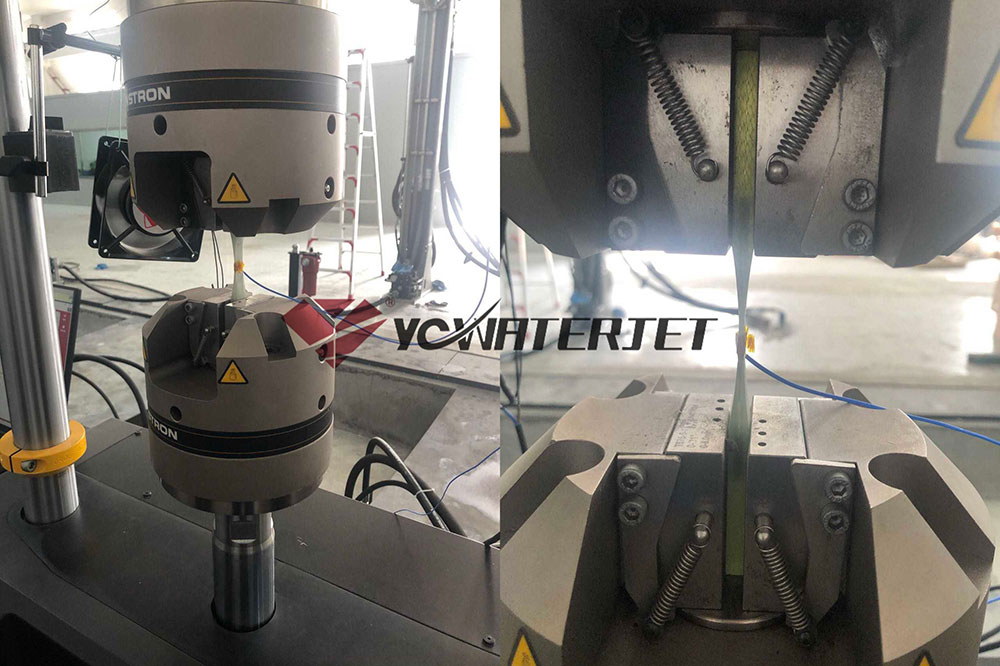 (图片名称:材料拉力测试) 合作期间,客户利用无锡永昌水刀的设备对碳纤维、玻璃纤维等复合新材料样品进行切割,并开展拉力测试。结果显示,切割后的样品在各项性能测试中表现优异,充分证明了无锡永昌水刀设备的精准度和稳定性,能够满足复合新材料行业对于高精度切割的严格要求。