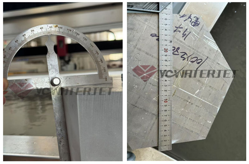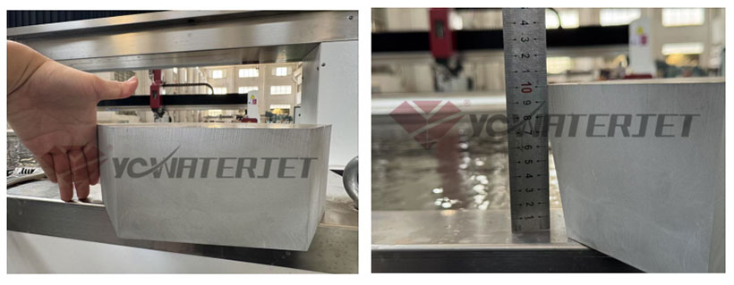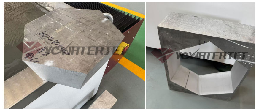 硬核挑战:百毫米铝材的高精度斜切 铝材料因其具有质量轻、强度高、耐腐蚀等优良特性,在航空航天、汽车制造、建筑装饰等众多行业中得到了广泛应用。然而,由于其特殊的物理性质,在对铝材料进行切割加工时,传统切割方式往往会面临诸如变形、热影响区大等问题。而水刀切割技术的出现,则为铝材料的切割提供了一种更为理想的解决方案。 永昌水刀此次采用的 3D大五轴技术,通过双摆角切割头(A轴±45°+C轴540°连续旋转) 配合龙门式刚性结构,在XYZ三轴平移基础上叠加角度补偿,同时在切割过程中同步修正射流轨迹,不仅避免了常规水射流“上宽下窄”的缺陷,更实现了100mm深厚度铝材的斜角一次成型,将“不可能”变为现实。