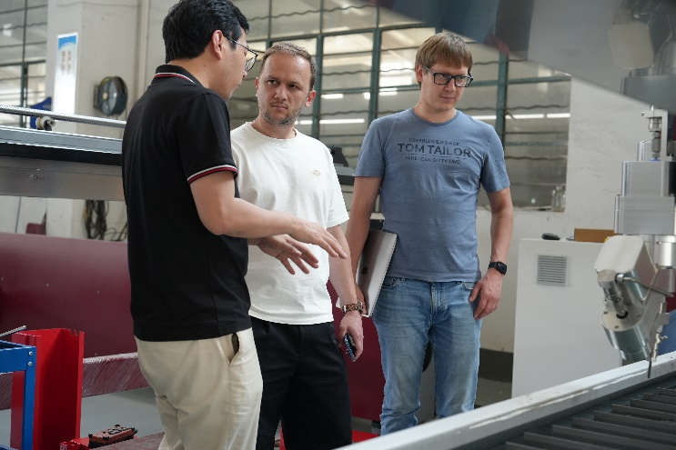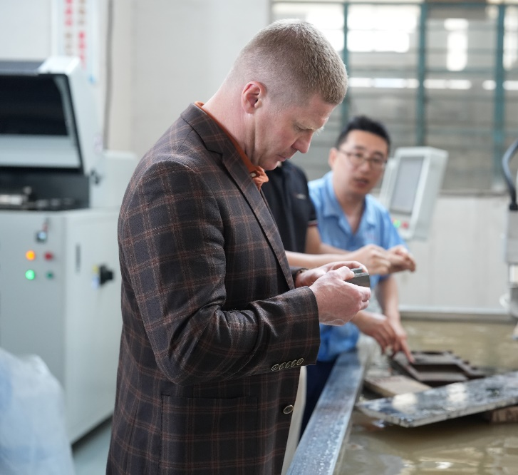 本次参观中,欧洲团队实地考察了生产车间与技术实验室,深入了解设备研发流程与质量管控体系,并现场观摩了五轴水刀切割复合材料的演示。双方围绕新能源设备切割需求展开技术研讨,永昌团队针对客户提出的材料特性与精度要求提供专业的定制化方案,获得了高度认可。目前双方已在定制化生产线方面达成初步合作意向,后续将进一步推动达成中欧高端装备技术协作。